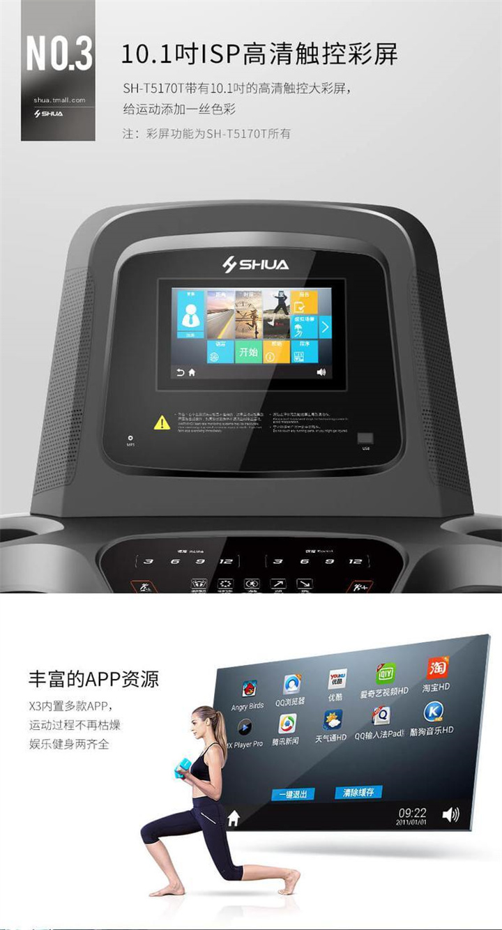 智能商用跑步机SH-T8919T-Y50(V1+)采用T2.2mm黑钻纹(可选配:T2.4免维护跑带)的跑带,选用手握心率测试 自带心率带及增加心率控速(HRC)程序模块测量心跳等数据,跑步宽度达580mm,可承受180kg的使用者使用。