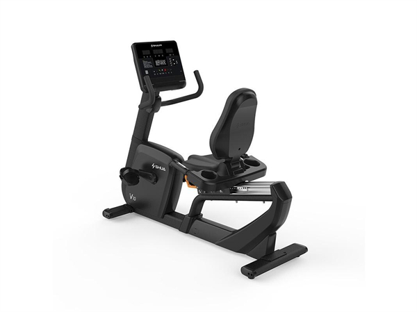 舒华V10商用卧式健身车SH-B9100R(LED版)采用轴承6005ZZ(台湾TPI),步幅曲柄长是170mm,如果换算步距是13.4英寸,具有水壶架和Ipad平板支架、USB充电功能,管座可纵向调整300mm和水平调整50mm,张力旋钮采用电动调整,制作电磁铁阻力,传输系统多沟皮带J型8沟。
