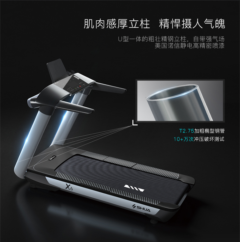 锐强体育推荐健身器材-舒华商用电动跑步机SH-T6500拥有10.1寸IPS高清触摸屏、Z型动感时尚外观设计、70×150mm精钢立柱机身、F级高效静音马达、520mm商用豪华跑带和35mm双层全跑台减震跑板等优势,让您享受科学跑步。